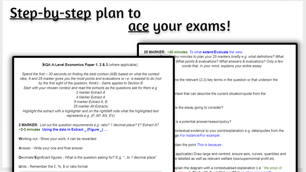 In the following PDF, I scripted a step-by-step plan on how to effectively write great essays to every type of question you can face in AQA A-Level Economics. I hope this helps and provides some clarity to you.